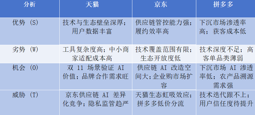 3. 总结2025年11月11日这场 AI 导购之战,本质是技术能力与商业基因的结合竞赛。天猫的先手棋能否转化为胜势,京东的供应链壁垒能否抵御冲击,拼多多的轻量化路径能否突破天花板,2025 年双 11 或将给出关键答案。