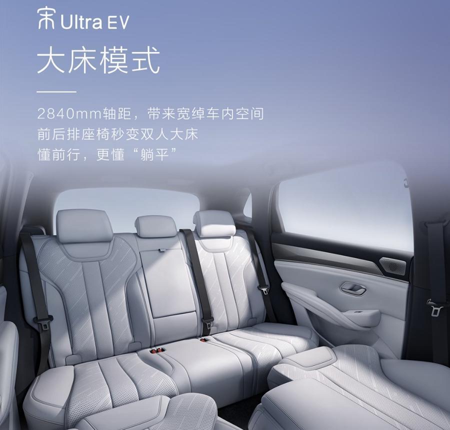 空间表现方面,比亚迪宋Ultra EV将具备4850/1910/1670mm的车身三围以及2840mm的轴距,并定位为五座中型SUV。而依照其相对宽大的尺寸编排以及官图中显示的“大床”模式设计,预计其车内空间表现还是比较值得期待的。